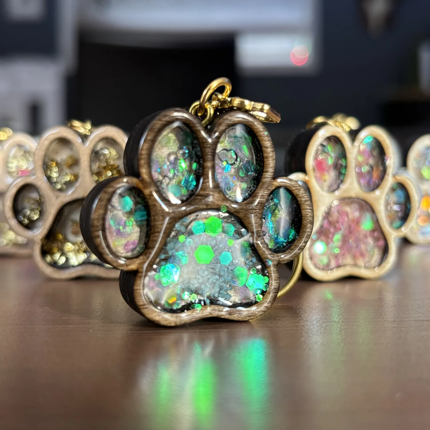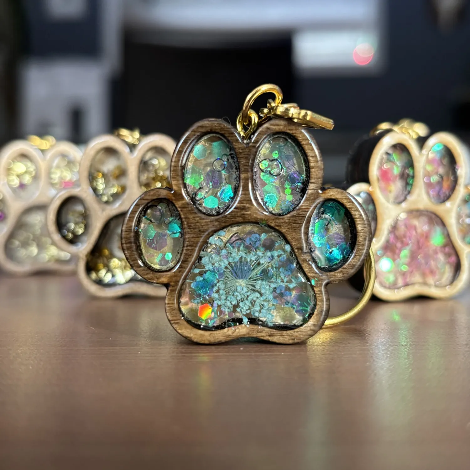 Brelok powstaje z wysokiej jakości drewnianej sklejki, a jego serce wypełnia przezroczysta żywica, w której zatopione są błyszczące ozdoby, subtelnie odbijające światło. Całość tworzy delikatny, a zarazem elegancki efekt, który przyciąga wzrok i podkreśla unikatowy charakter produktu.