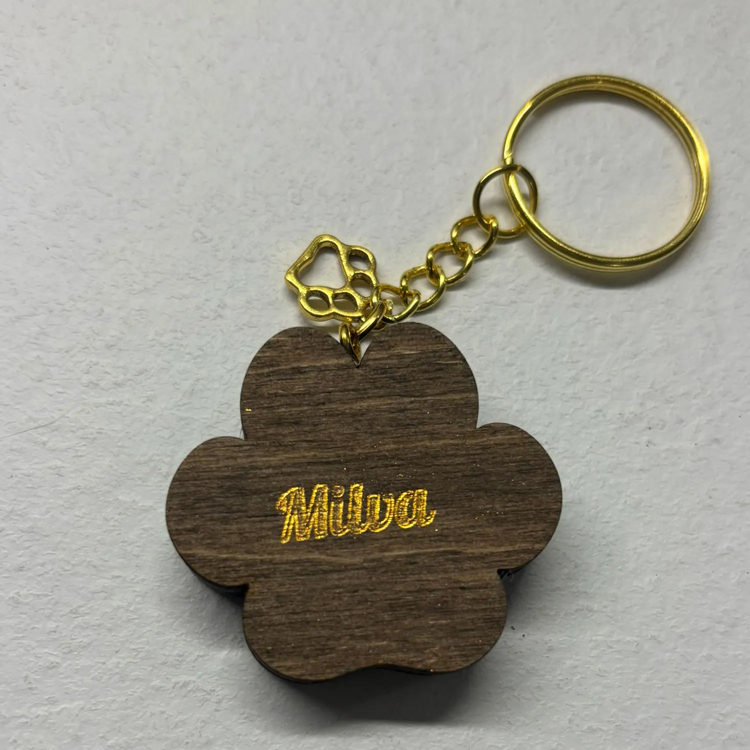 Ręcznie robiony brelok z imieniem psa – drewniany, personalizowany, z pozłacanym łańcuszkiem