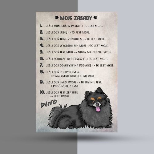 Tabliczka moje zasady – szpic miniaturowy czarny (z imieniem)